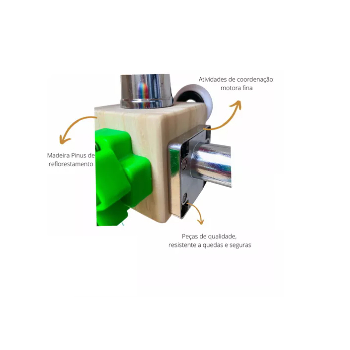 Seguro e ergonômico: Feito em madeira Pinus lixada, com bordas arredondadas e peças pensadas para as mãos pequenas, garantindo total segurança.