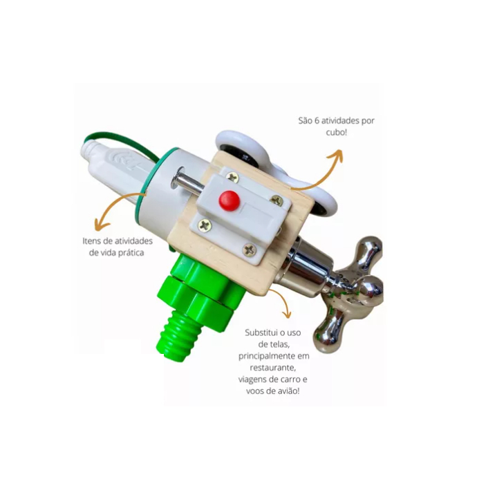 As cores dos itens são sempre as mesmas da foto? Não. As cores dos itens constantes no cubo podem variar (azul, verde, vermelho, branco, etc.), mas a funcionalidade e o tipo de atividade são sempre os mesmos.